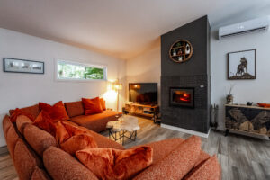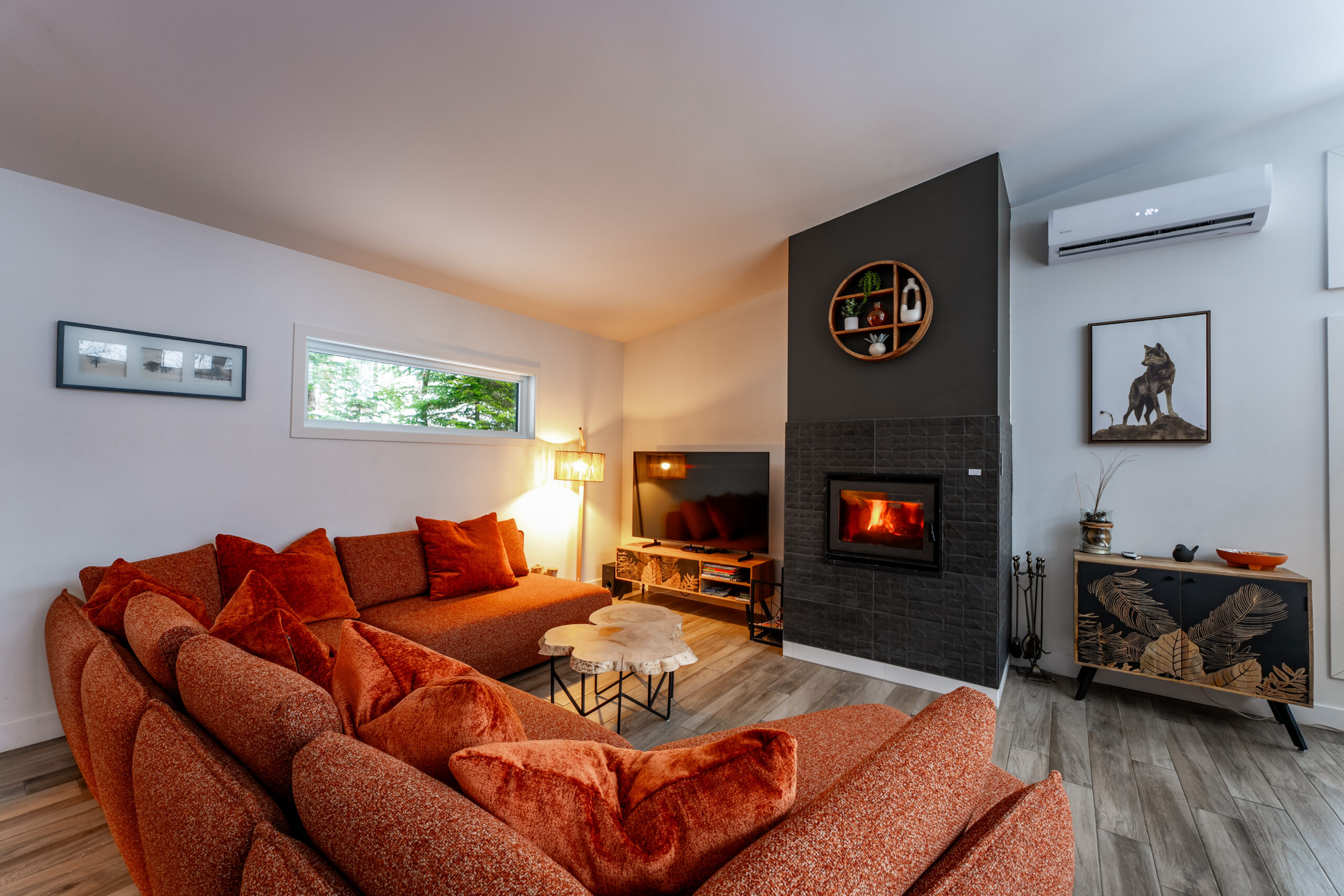Le salon principal, spacieux et soigneusement aménagé, invite à la détente grâce à ses canapés moelleux, son foyer au bois, ses fauteuils élégants et sa grande télévision à écran plat. À l’étage, la chambre des maîtres est dotée d’un lit King et de sa propre salle de bain privée, pour un confort absolu. Une deuxième chambre sur le même étage dispose d’un lit queen et de sa propre salle de bain attenante.