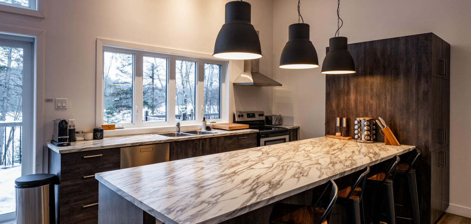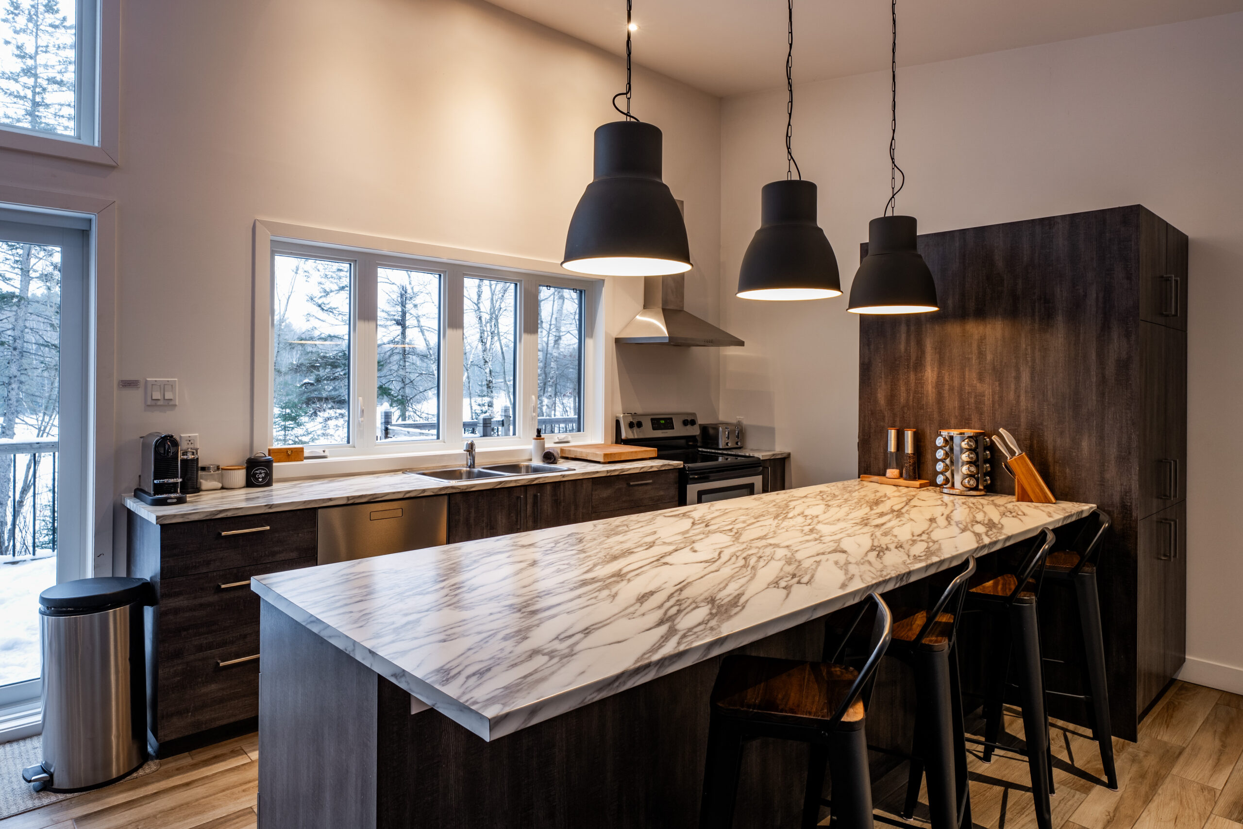 L’entrée du chalet se fait par l’étage supérieur. En entrant dans le chalet, vous trouverez un grand vestiaire fermé dans l’entrée. La cuisine, entièrement équipée avec un grand îlot central, allie fonctionnalité et raffinement avec ses électroménagers de qualité : réfrigérateur, cuisinière, four, lave-vaisselle, micro-ondes, cafetière et grille-pain. La vaste salle à manger, conviviale et lumineuse, peut accueillir jusqu’à huit convives dans une ambiance chaleureuse.
