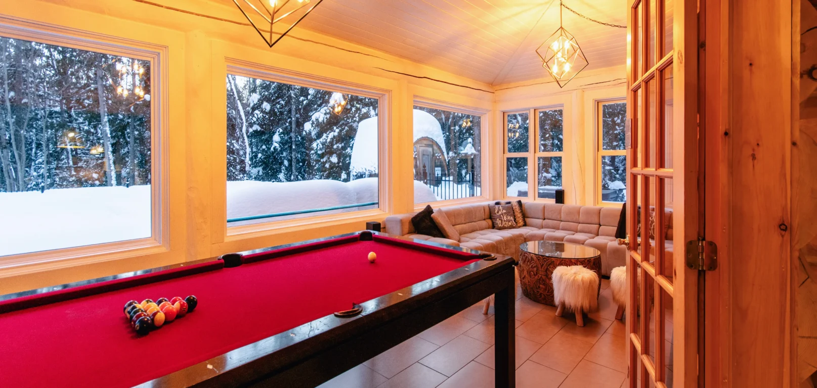 Nous avons passer un super moment dans ce chalet, nous avons manqué de rien, tout ce que l'on a besoin est a portée de mains! La cuisine est très bien équipé pour se faire des gros souper (méga festin) puis, avec le spa et le sauna sec extérieur, c'est parfait pour se détendre en hiver! Cest grand ,luxueux et la table pour 12 personne se transforme en table de billard format standard Tout pour avoir du fun Tout ce qu'on peu faire comme activités aux alentours est bien indiqué dans un cartable a l'entrée du chalet, ainsi que tout les trucs necéssaires a l'entretin de ce dernier, le code wifi et toute les autres comodité y sont aussi indiqué! Paix et tranquilitée sont au rendez-vous dans ce coin magnifique! Voilà